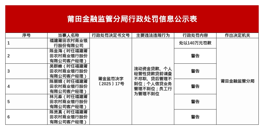 福建莆田农商行被罚140万,涉贷款管理不到位等