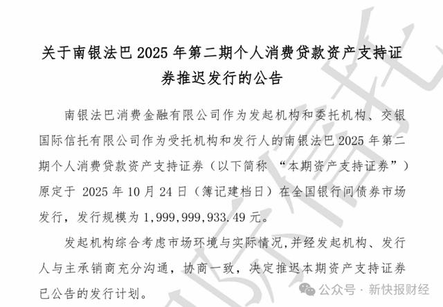 南银法巴消金ABS发行生变,20亿元融资计划暂缓